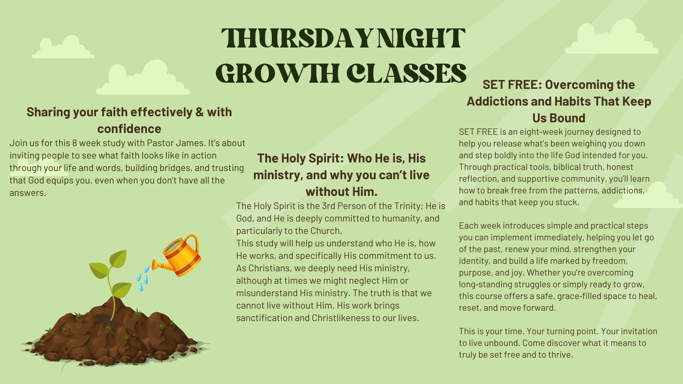 Our Growth classes will start back up January 15, 2026. Join us Thursday nights at 6:00PM at the Oracle Campus. We will Provide a meal (donations are welcomed) that starts at 6:00PM and Classes will start at 6:30PM-7:30PM. Childcare is provided.